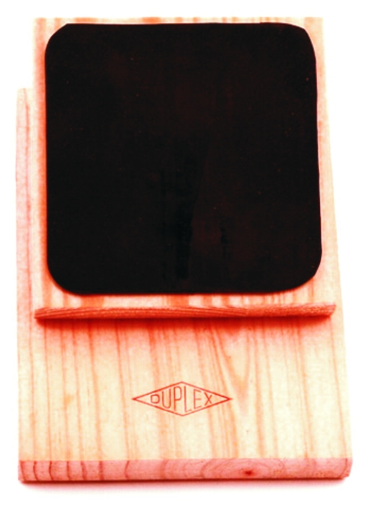 Economy student practice pad. Base of natural wood 7 1/4" x 4 1/2". Rubber pad measures 3" x 4".